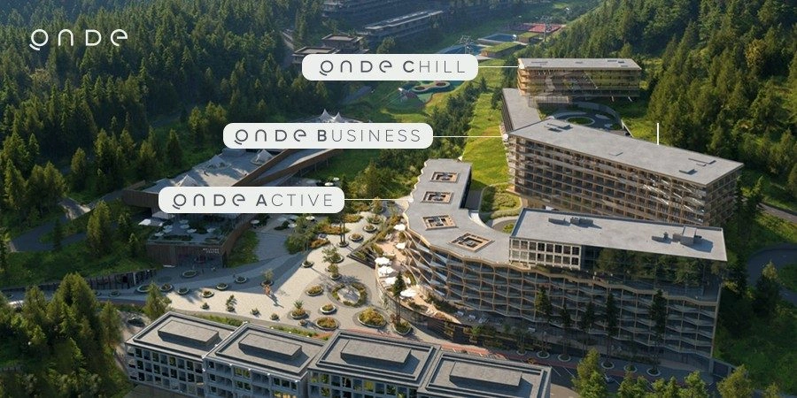 ONDE Active is a thematic hotel for active recreation with 197 rooms, a retail gallery, cinema, bowling, rooftop restaurant with fireplaces, a live-music pub, and a climbing wall. Sales opened in March 2025; most rooms have already been sold.